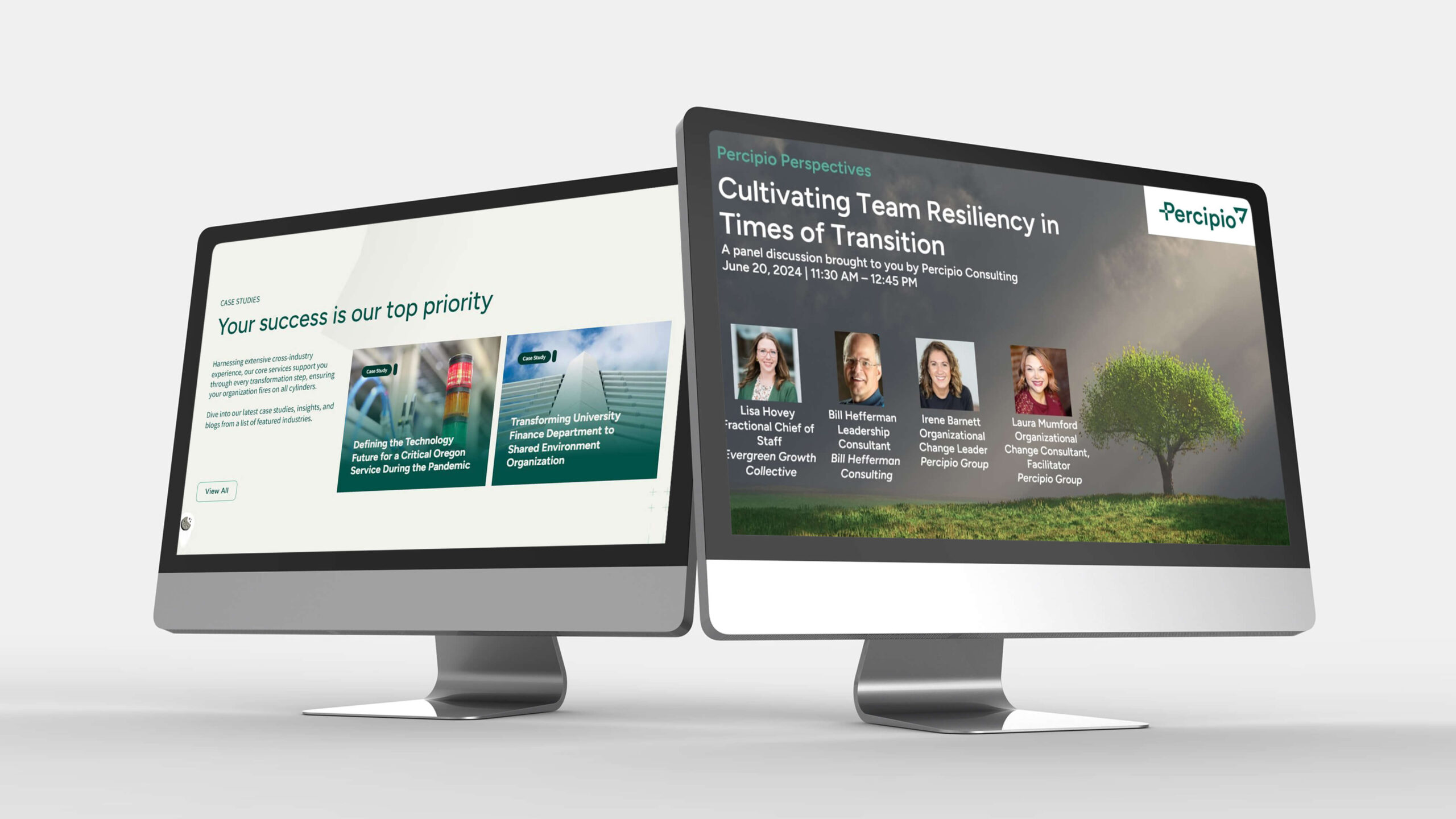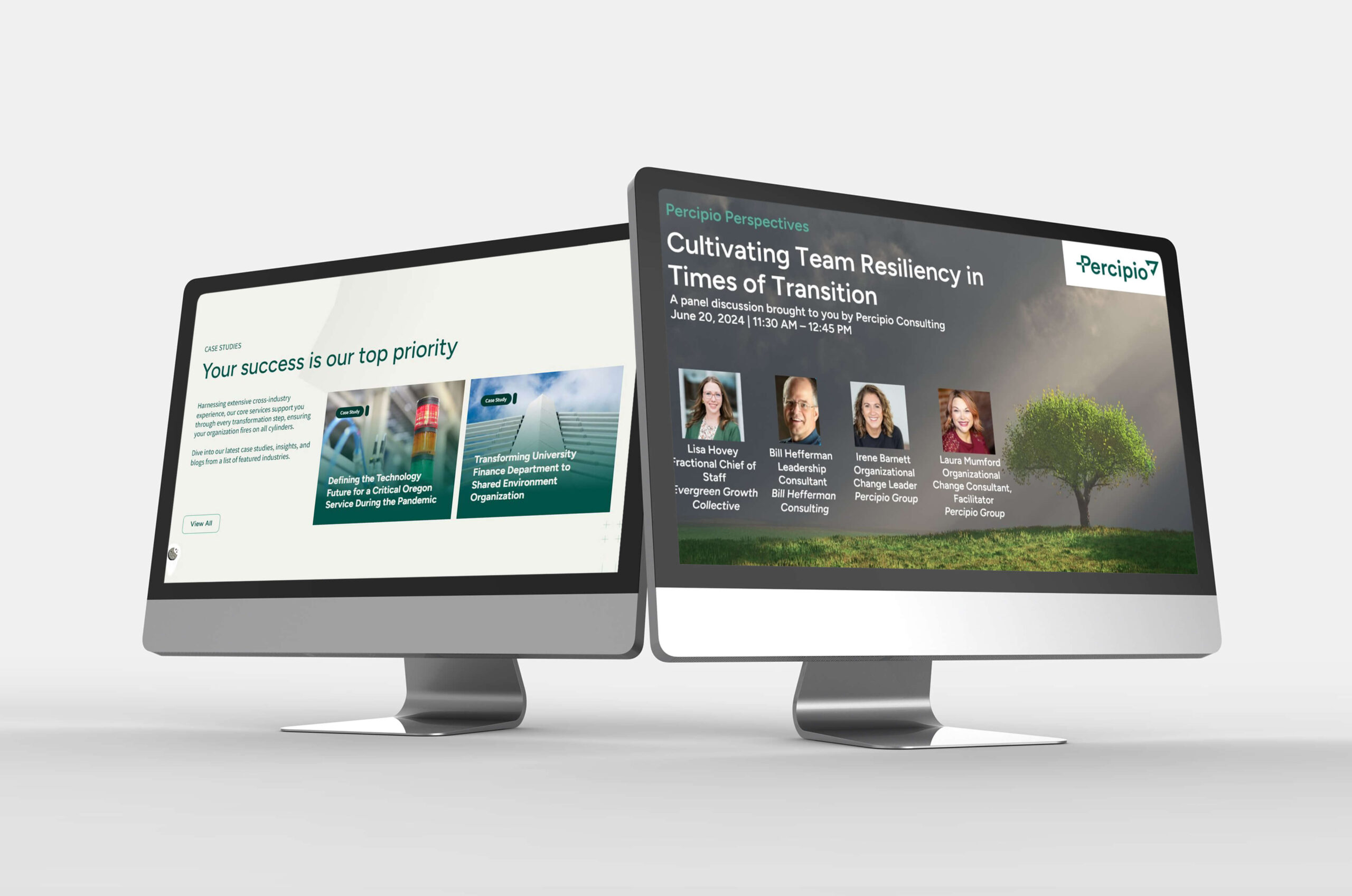 The rebranding process extended across every touchpoint. Watson designed a modernized visual identity that incorporated regional themes, reinforcing Percipio Group’s commitment to the Pacific Northwest. The website underwent a complete transformation, with improved navigation, clear messaging, and a streamlined user experience. Content was developed to highlight their consulting expertise, thought leadership, and case studies, providing potential clients with immediate insights into their approach and impact.