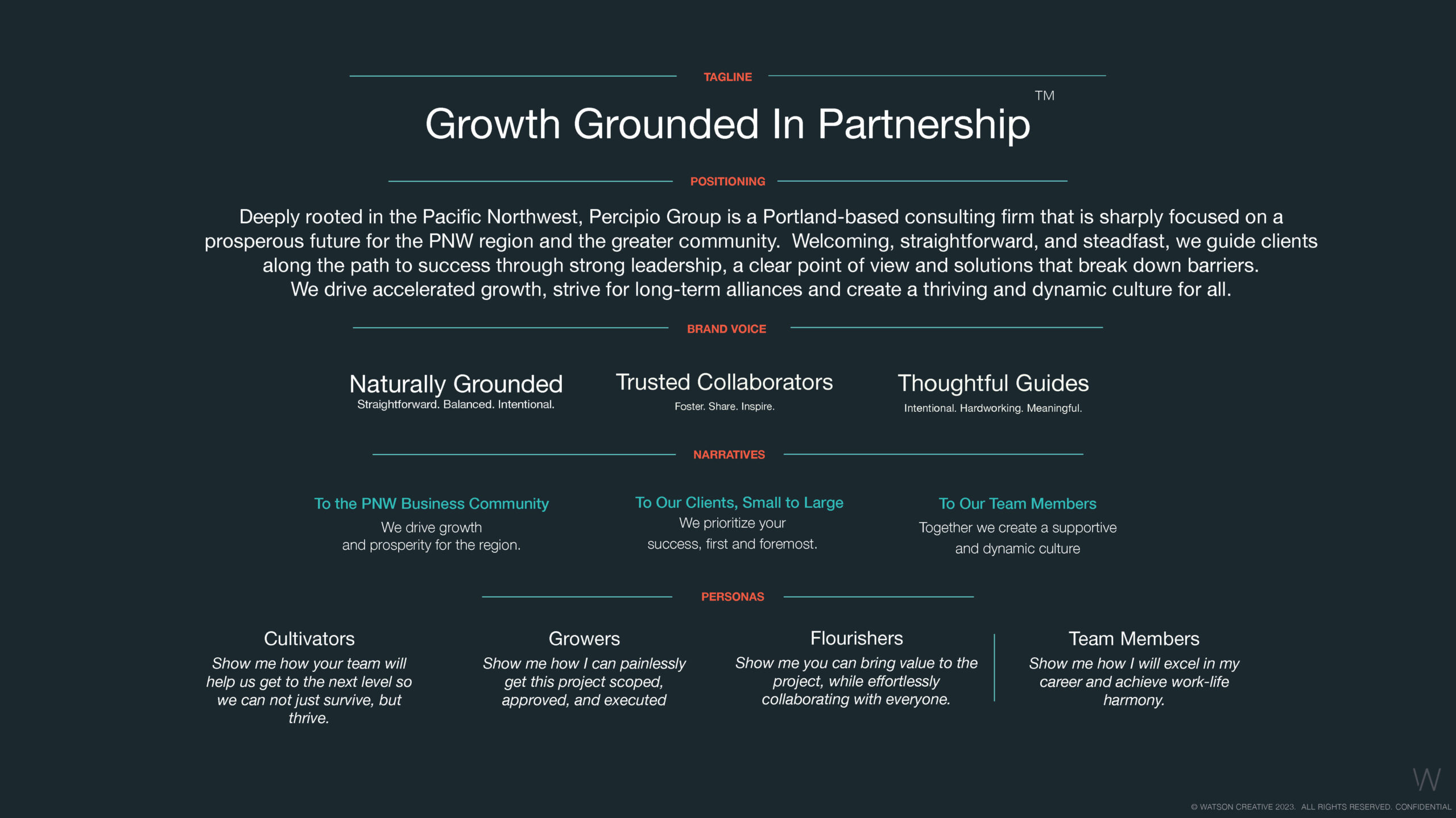 “The work with Watson was transformational for Percipio Group. Their ability to distill our values into a powerful, resonant brand strategy has strengthened our position in the Pacific Northwest.” – David Kalman, Percipio Group
